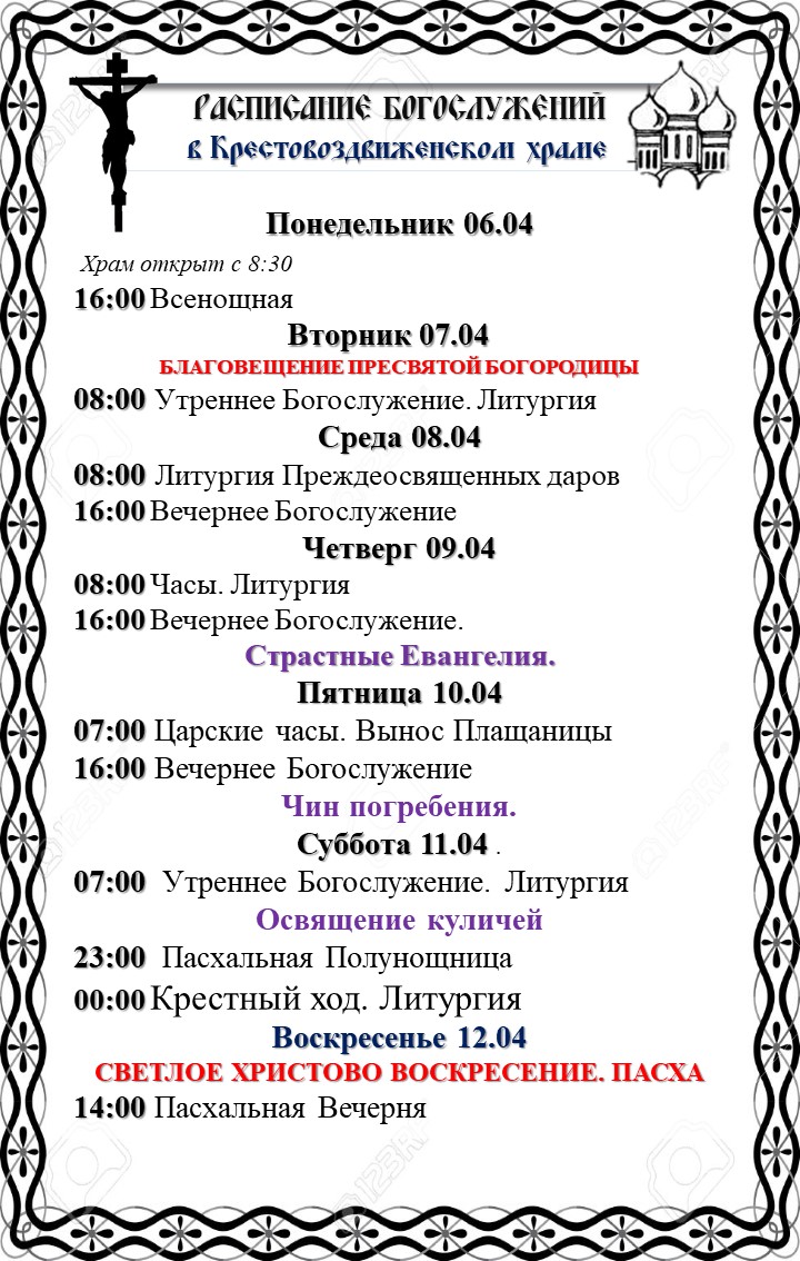 Расписание Богослужений в Крестовоздвиженском Храме